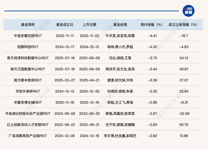 上周跌幅排名前十的公募REITs