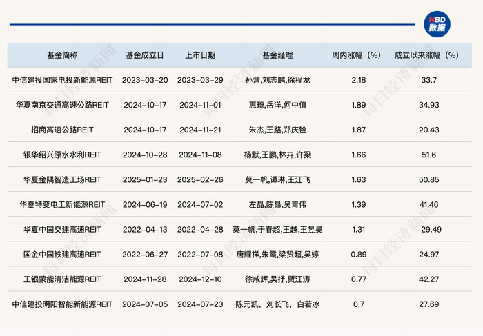 上周涨幅排名前十的公募REITs